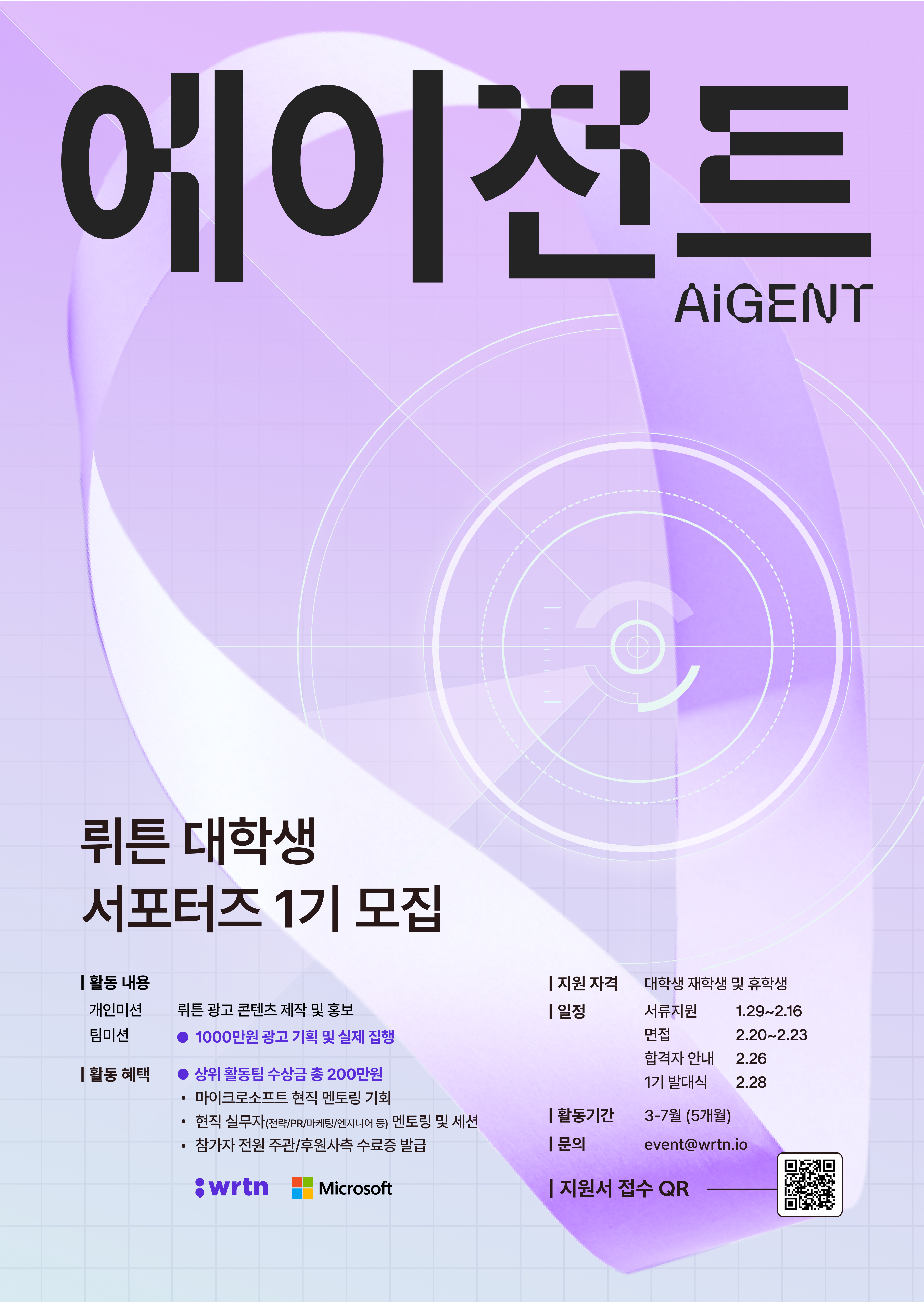 뤼튼테크놀로지스 주관 대학생 서포터즈 뤼튼 대학생 에이전트 1기를 모집합니다. 생성 AI 프로덕트인 ‘뤼튼’을 활용한 각종 콘텐츠를 기획하며, 광고 1000만원을 활용하여 실제 집행까지 할 수 있는 프로그램입니다. 뤼튼테크놀로지스 소속 현직 실무자와 마이크로소프트 소속 실무자들의 멘토링이 매달 이루어집니다.