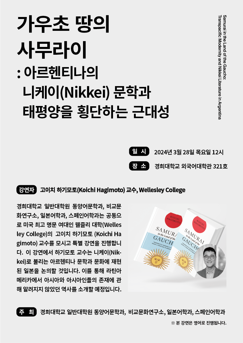 경희대학교 스페인어학과와 비교문화연구소가 미국 웰즐리 대학의 고이치 하기모토(Koichi Hagimoto) 교수를 초청하여 <가우초 땅의 사무라이: 아르헨티나 니케이 문학과 태평양을 횡단하는 근대성>을 주제로 강연을 개최하니 많은 관심 바랍니다. 관심 있으신 회원 여러분께서는 첨부파일을 확인하여 주시기 바랍니다. 아울러 본 강연은 촬영을 예정하고 있으니 추후에 강연 영상이 필요하신 분들은 경희대 비교문화연구소로 연락주시기 바랍니다.