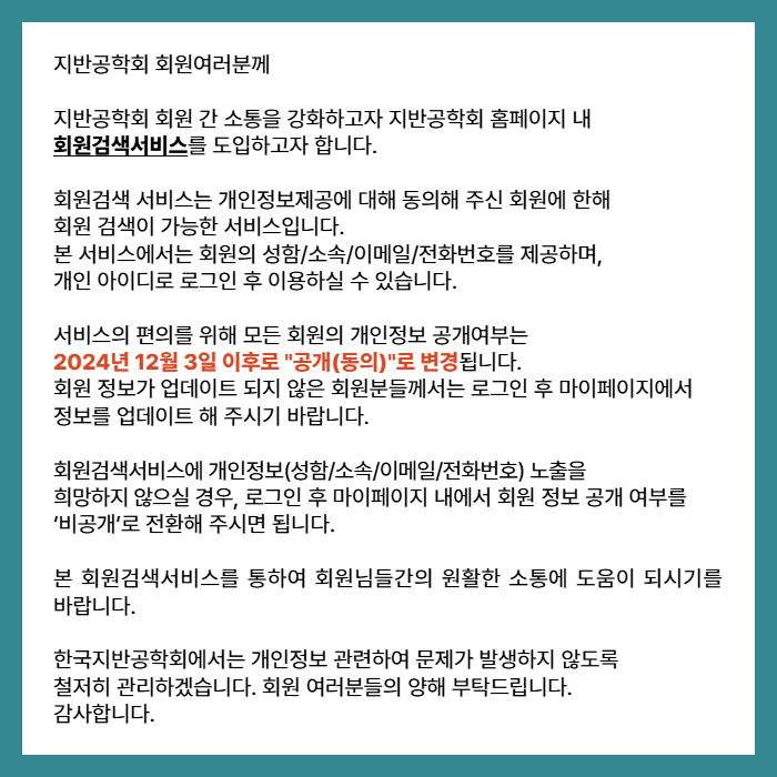 지반공학회 회원간 소통을 원활하게 하고자 지반공학회 홈페이지 내 회원 검색 서비스를 도입하고자 합니다.