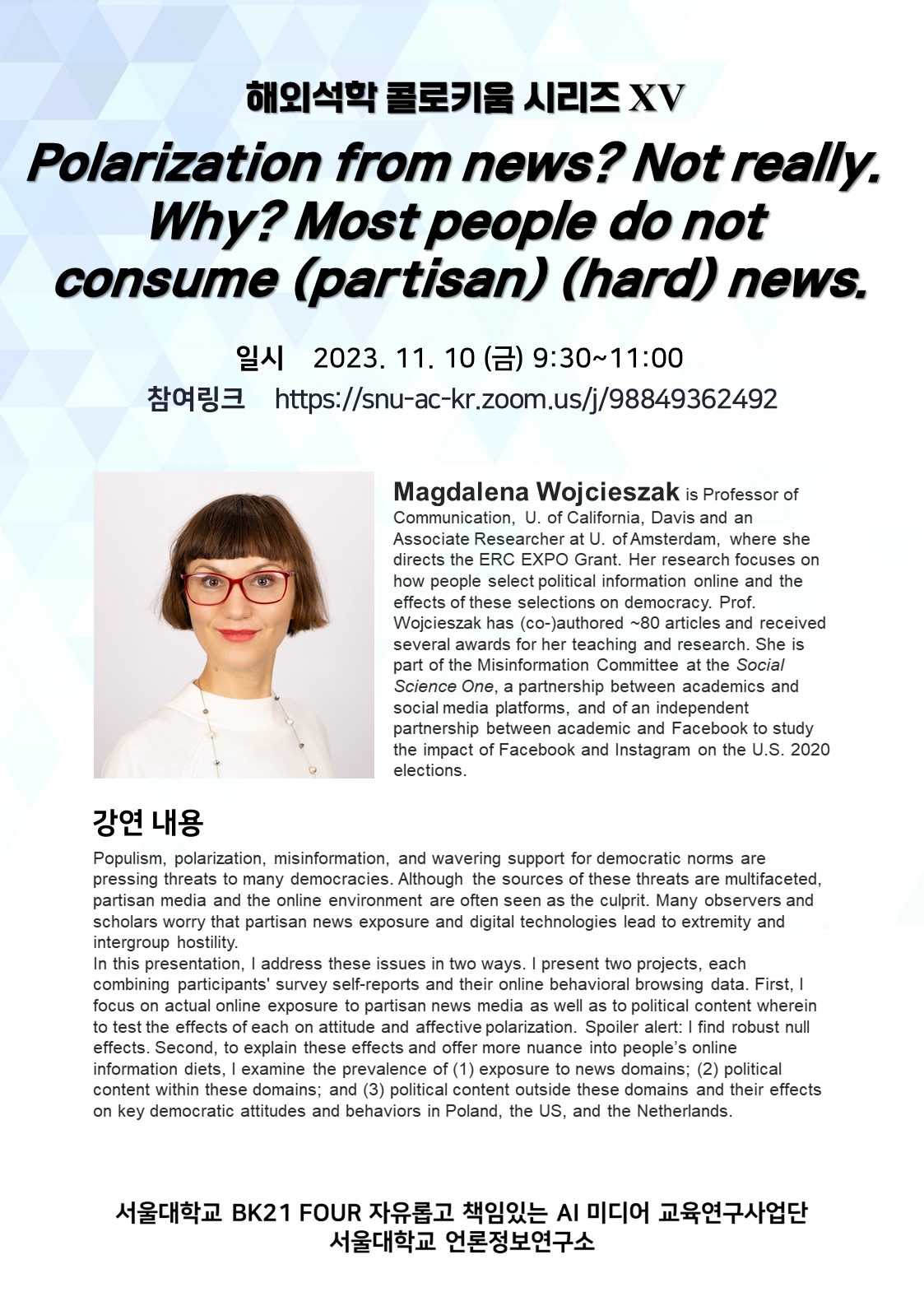 2. 서울대학교 언론정보학과 BK21 FOUR "자유롭고 책임있는 AI 미디어" 교육연구단과 언론정보연구소에서는 커뮤니케이션학계 해외 유수 학자들을 초청해 다양한 주제의 강연 시리즈를 개최하고 있습니다. 이에 다음과 같이 안내해 드리니 관심 있는 회원님들의 많은 참여 바랍니다.