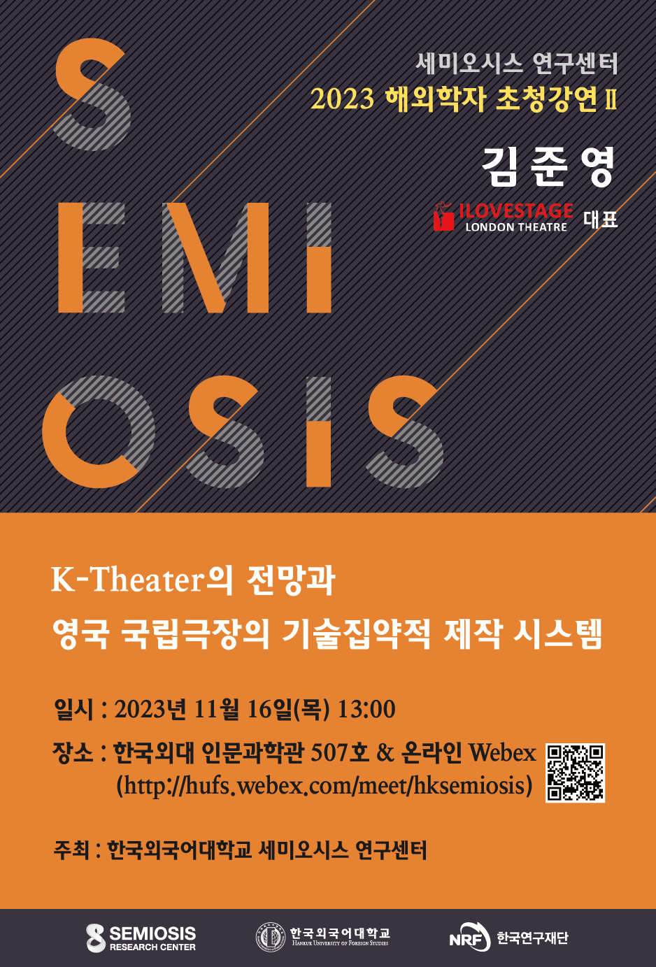장   소: 한국외대 인문과학관 507호 & 온라인 Webex (링크https://hufs.webex.com/meet/hksemiosis / 포스터 내 QR 접속)